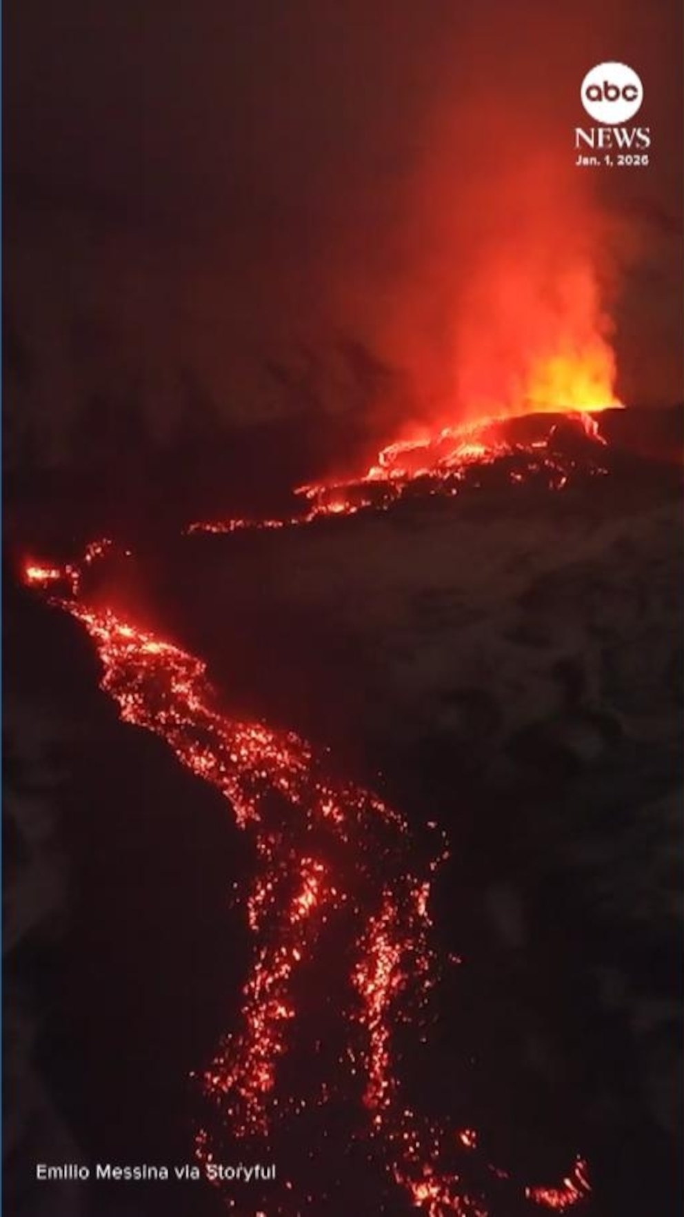 A drone captured stunning footage of lava flowing from a fissure on Italy’s Mount Etna on New Year’s Day.