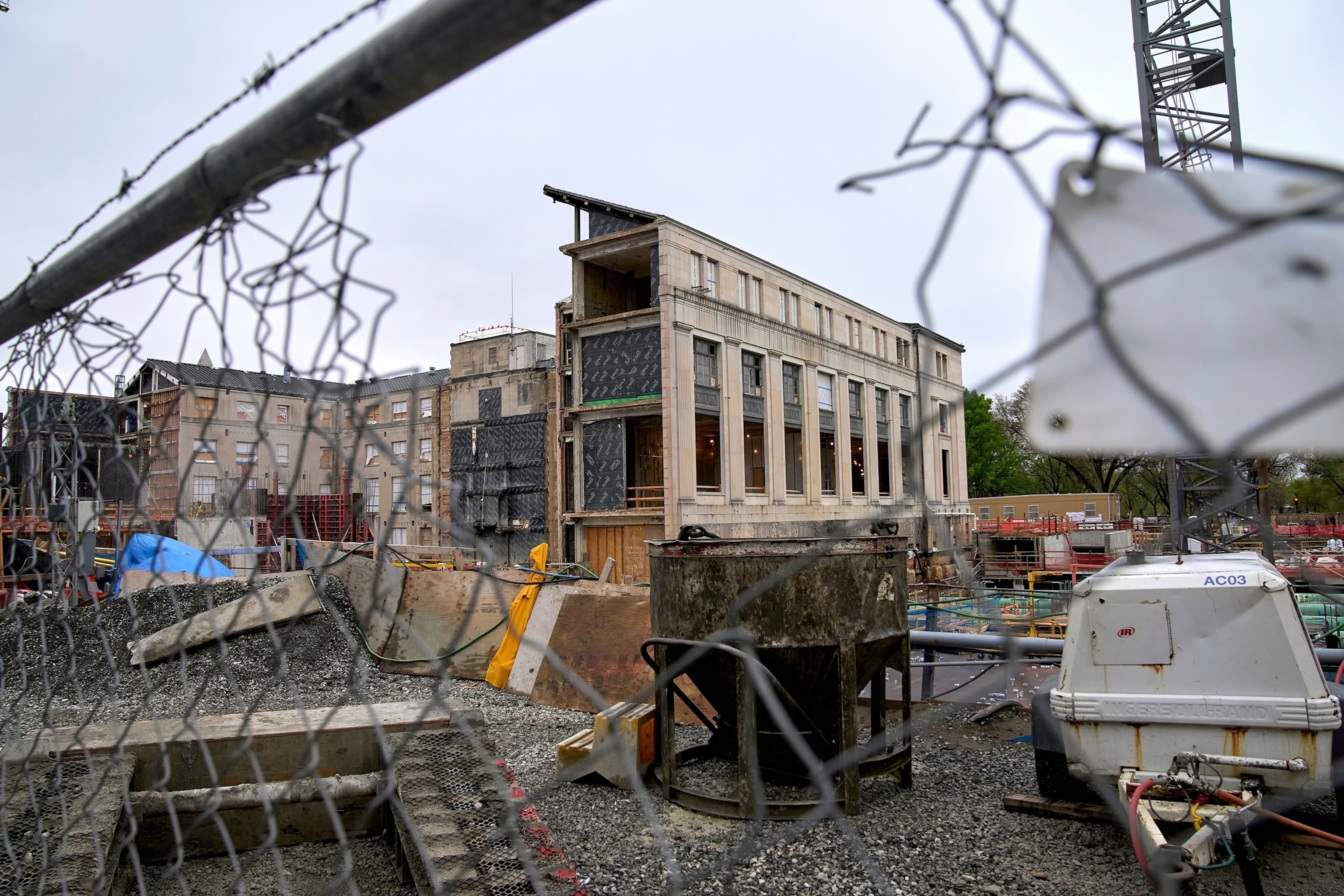 A building in the Federal Reserve complex, which is under construction, is seen through a hole in construction fencing, April 7, 2025, in Washington.